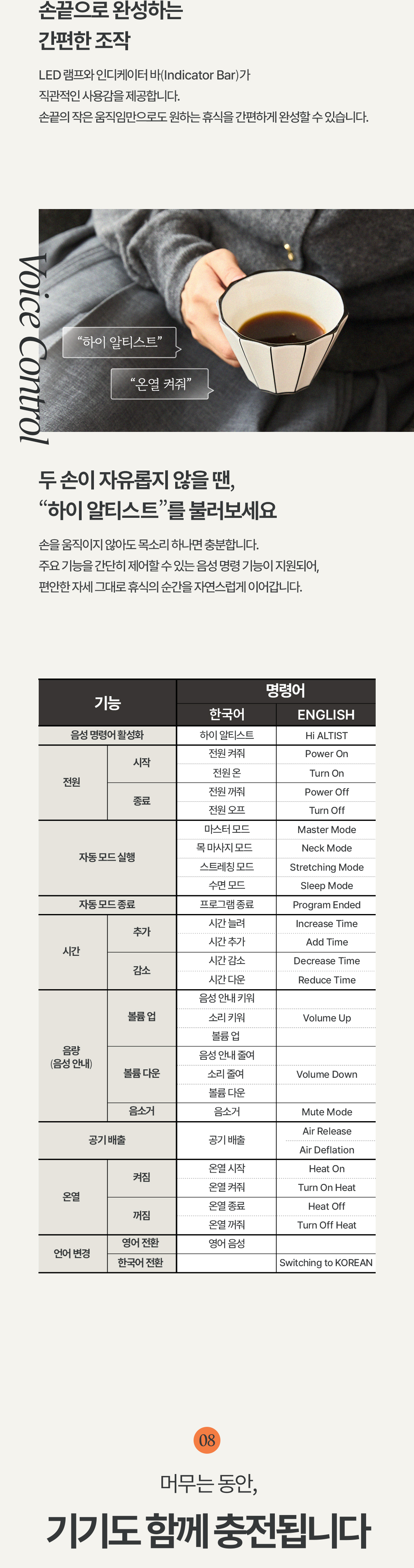 -온열 기능 사용 시 맨살이 직접 닿지 않도록 하며, 피부가 예민한 분, 고령자, 어린이는 반드시 보호자의 감독 하에 사용하십시오.
